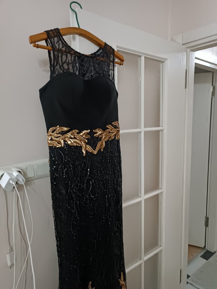 Siyah uzun abiye elbise, straplez yakalı ve dantel işlemeli. Bel kısmında altın nakış detayları bulunur, düğünlere uygundur. ✨