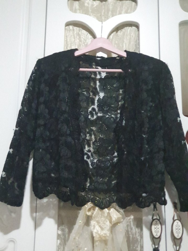 Fitted kesim siyah bolero, uzun kollu ve yaka detaylıdır. Nakışlı dantel gupur kumaştan yapılmıştır, gotik ve bohem tarzına uygundur.