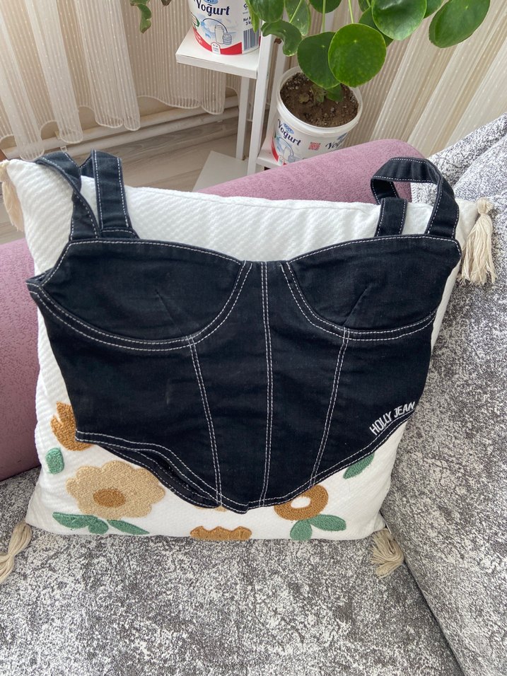 Fitted siyah denim büstiyer, nakışlı detaylar, askılı ve fermuarlı, günlük sokak stili için uygun. ✨