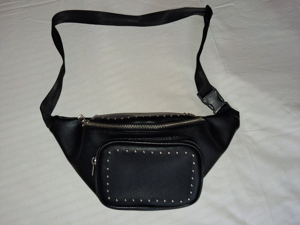 Nakışlı detaylar ve perçin süslemeli siyah deri bel çantası, bel kemerli tasarımıyla sokak stiline uygun ve günlük kullanıma elverişli.