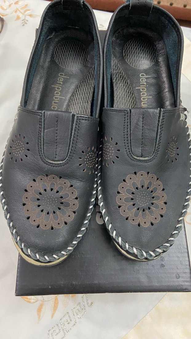 Nakışlı desenli, dolgu topuklu, tokalı siyah deri kadın babet. Bohem ve minimalist tarz için uygundur. Marka: deripabu. İki yada üç kere kullanıldı
