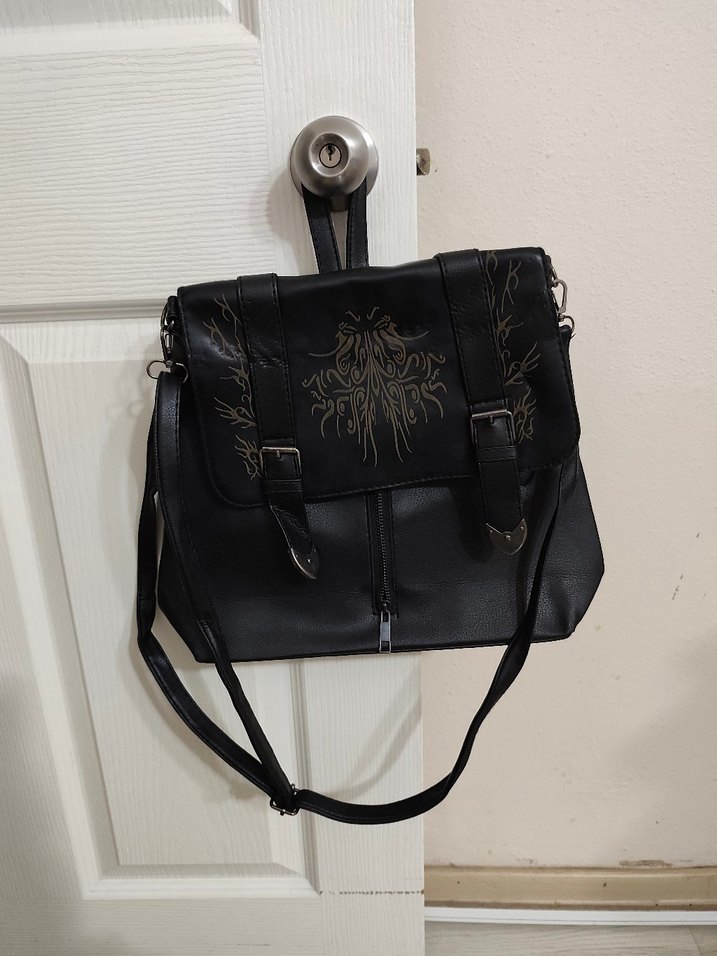 Nakışlı detaylar ve tokalı kayışlara sahip siyah deri çanta, gotik, bohem ve retro tarzlar için uygun. Günlük kullanıma uygun. vintage çanta fermuatlari mıknatıslari çalışıyor