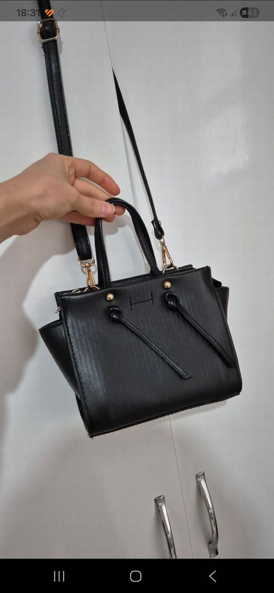 Parlak siyah deri kadın çantası, nakışlı deseni ve fermuarlı kapanışı ile minimalist tarzda. Ayarlanabilir omuz askısı ve sağlam sap içerir.