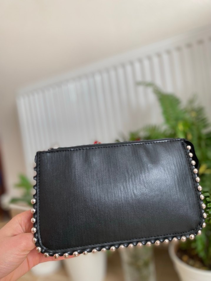Siyah deri kadın çanta, nakış detaylı ve fermuarlı. Kenarlarında gümüş renkli perçinler bulunur, rock punk tarzını yansıtır. Günlük kullanım için uygun. Zıncırı mevcut değil. Defosuz