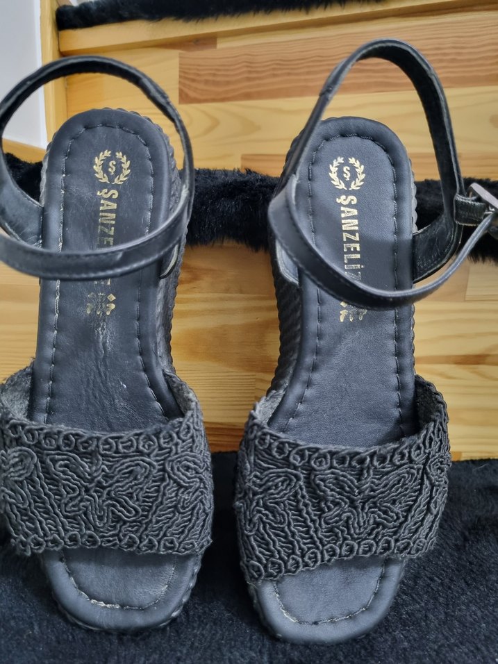 Siyah nakışlı detaylara ve tokalı kayışlara sahip, kauçuk malzemeden yapılmış dolgu topuklu sandalet. Günlük kullanım için bohem tarzda. ön tarafı 3cm topuk 6cm dir