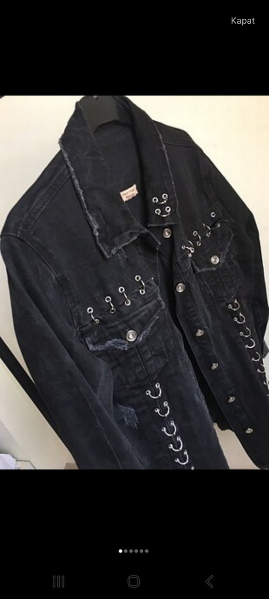 Siyah kot ceket, düğmeli, bol kesim ve nakış detaylı. Askılı kollu ve kesik yaka, günlük kullanıma uygun. ✨