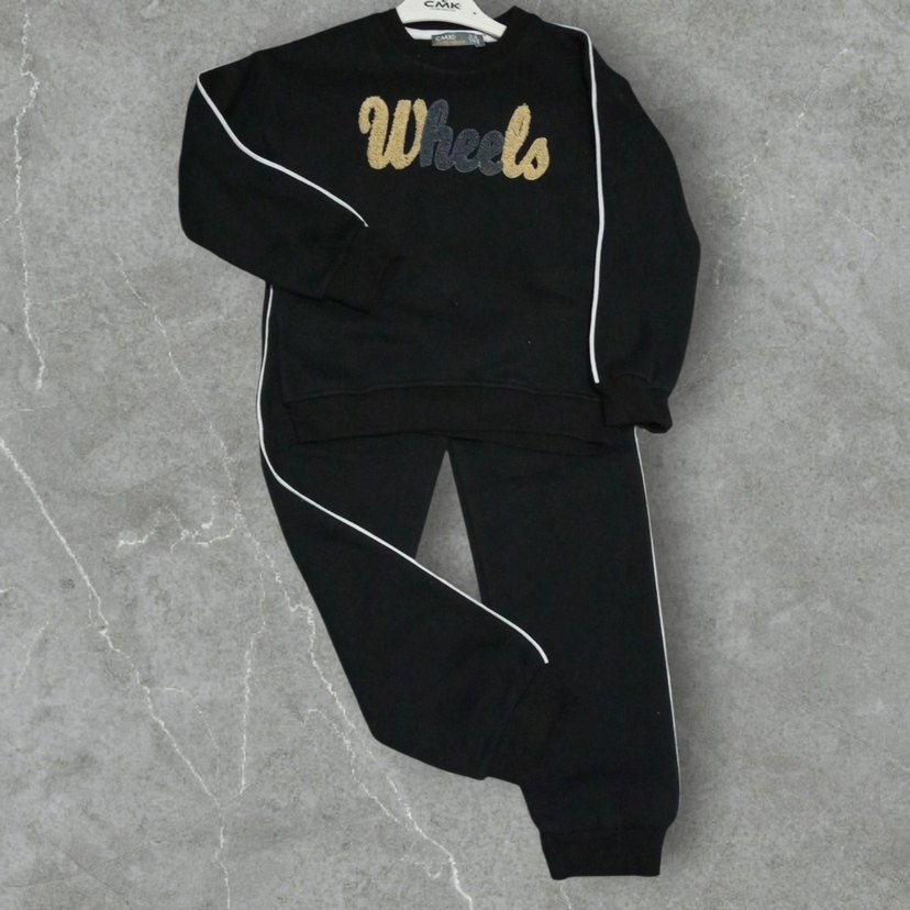 Siyah, nakışlı "Wheels" yazılı, erkek çocuk eşofman takımı. Yumuşak ve sıcak kumaştan, beyaz şerit detaylı. 4.5/5.6/7.8/9.10 yaşlar