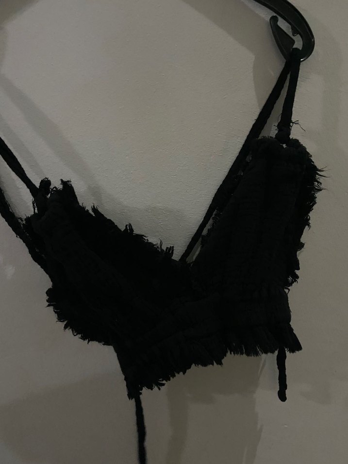 Siyah renkli, nakışlı ve fırfırlı detaylara sahip, keten kumaştan yapılmış, halter yaka ve askılı, kısa mini bustiyer. Gotik tarzda, günlük kullanıma uygun.