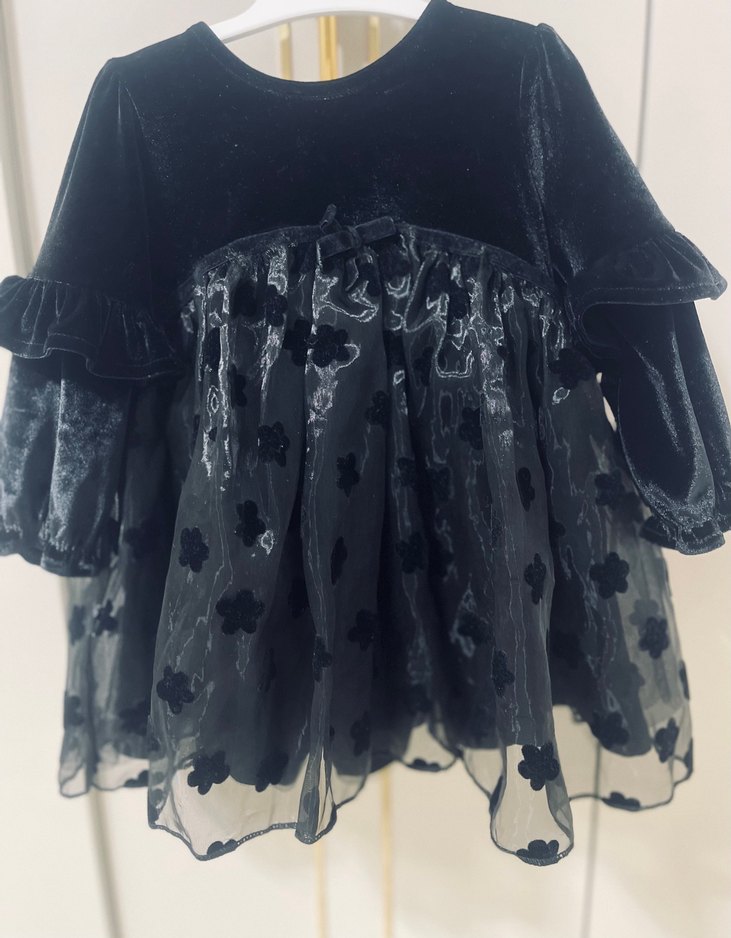 Uzun kollu, yuvarlak yakalı ve bol kesimli siyah gotik kız elbisesi. Fırfırlı detaylar ve işlemeli çiçek desenli şeffaf katman içerir.