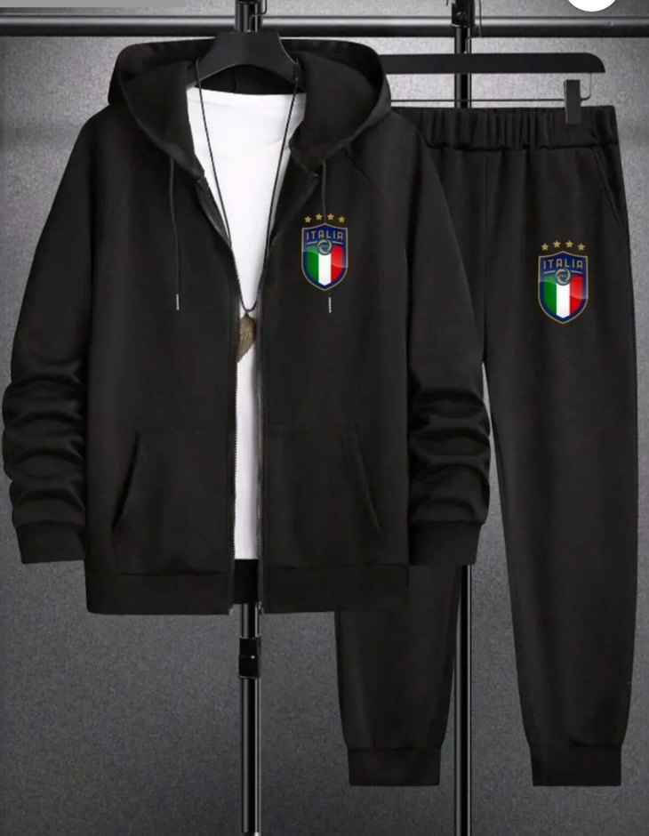 Kadın eşofman takımı, fermuarlı kapşonlu üst ve nakışlı İtalya armalı pantolon içerir. Yumuşak kumaş, uzun kollu ve regular fit ile günlük kullanıma uygundur.
