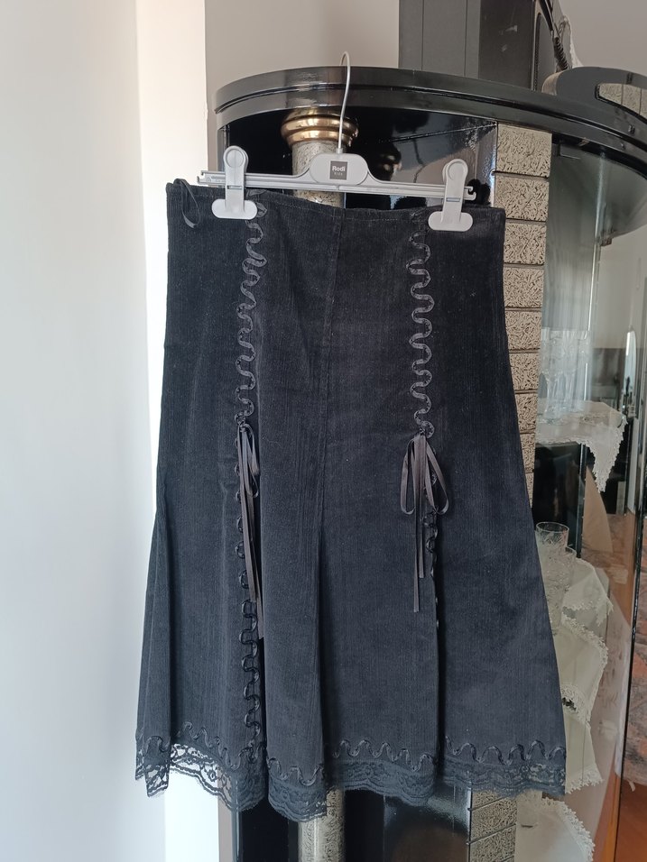 Siyah nakışlı, kemerli ve kadife kumaştan yapılmış, dar kesim uzun etek.