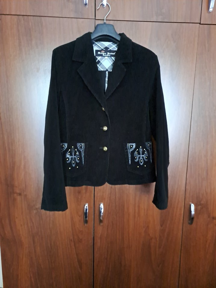 Siyah kadife kumaştan yapılmış, düğmeli ve yakalı kadın blazer ceket. Uzun kollu, nakışlı cepleri ile gotik tarzda, regular fit ve kısa boyda, ofis için uygun.