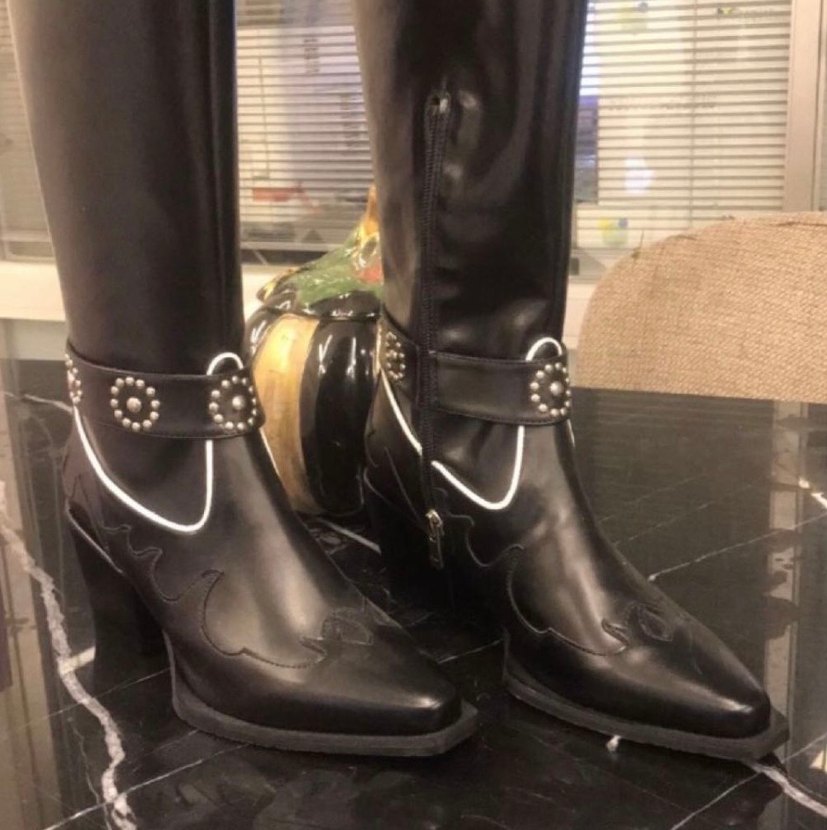 Parlak siyah deri dizüstü çizmeler, nakışlı detaylarla. Gotik tarzda, stiletto topuklu ve tokalı kayışlı, rock punk havası taşıyor.