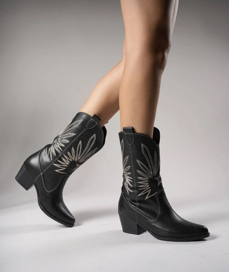 Siyah Nakışlı Kadın Deri Kovboy Çizmesi