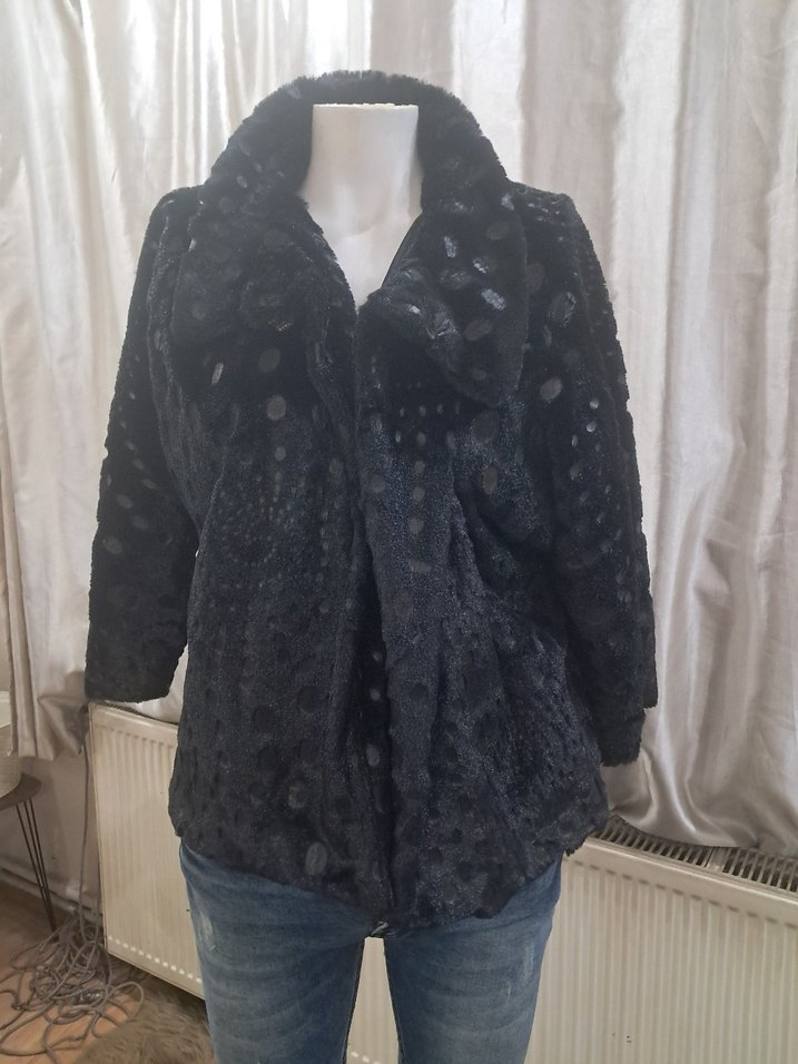 Nakış detaylı siyah kısa peluş mont, yaka kısmı kesik ve uzun kolludur. Salaş kesimiyle rahat ve günlük kullanıma uygundur.