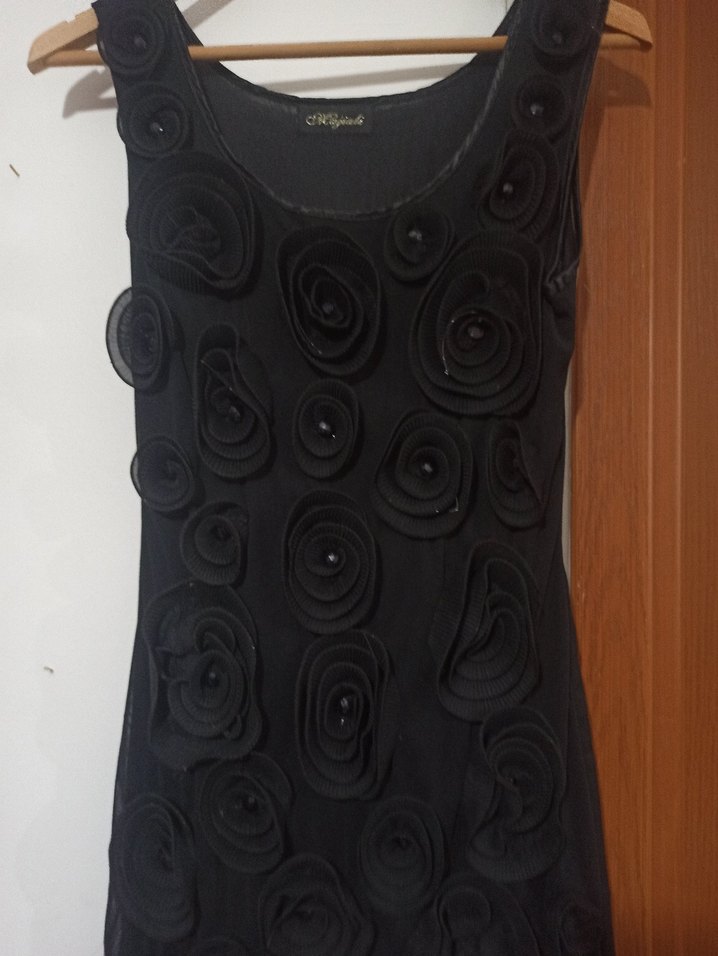Dar kesim, kolsuz siyah abiye elbise, yuvarlak yaka ve detaylı nakışlı fırfır süslemelere sahiptir. Avant-garde parti tarzı için uygundur.