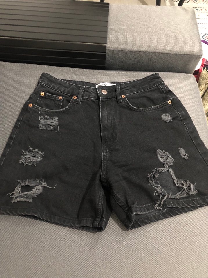 Nakışlı ve yırtık detaylı, bol kesim siyah kot şort. Tokalı tasarıma sahip, trend sokak stili için uygun.