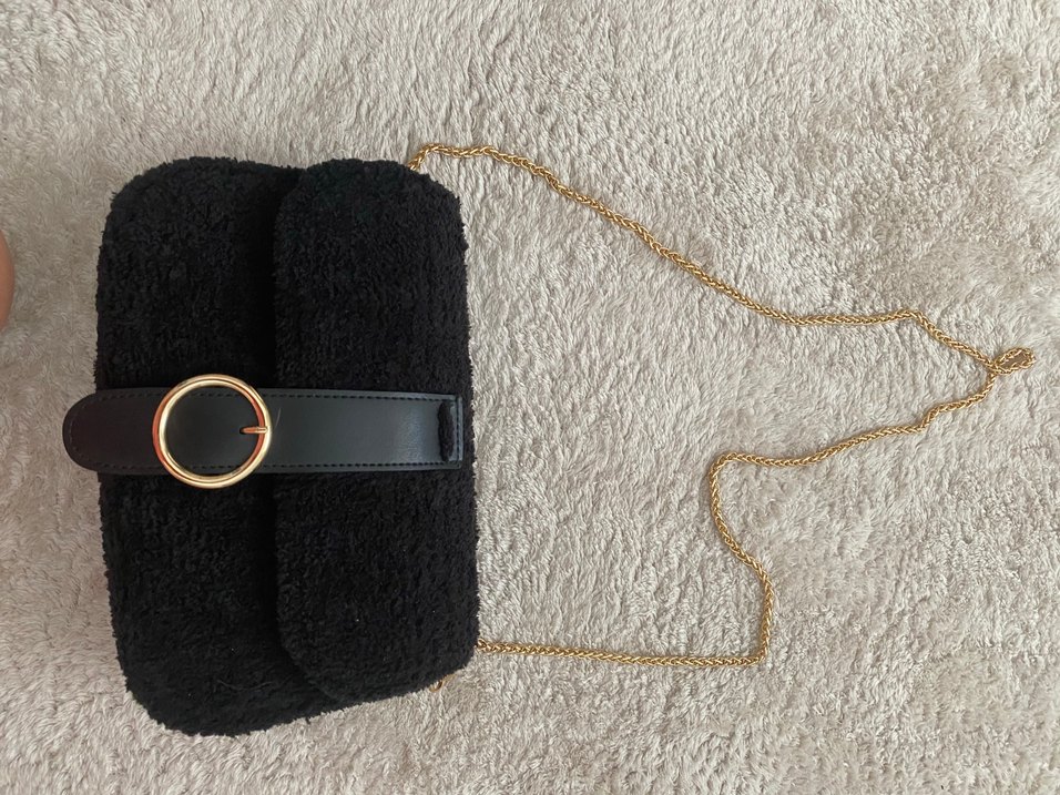 Yumuşak, kürk detaylı ve nakışlı siyah kadın çantası. Altın zincir askısı ile sokak stiline uygun rahat bir model.