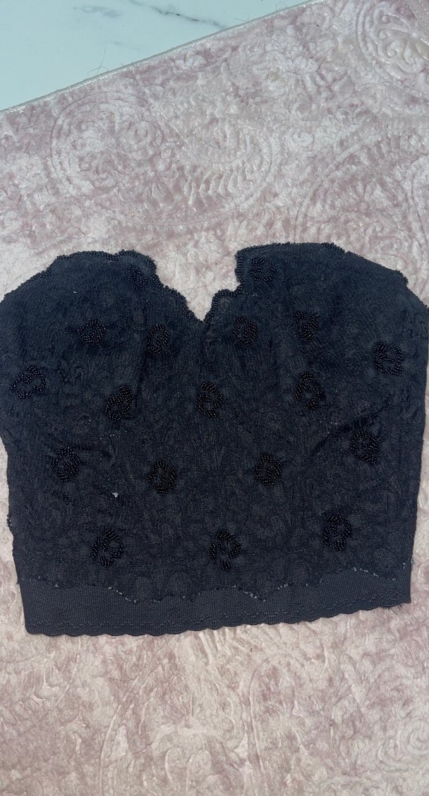 Nakışlı detaylar ve kürk süslemelere sahip siyah straplez, vücuda oturan ve kolsuz tasarımlı büstiyer. Rahat goth tarzında, midi boyda.