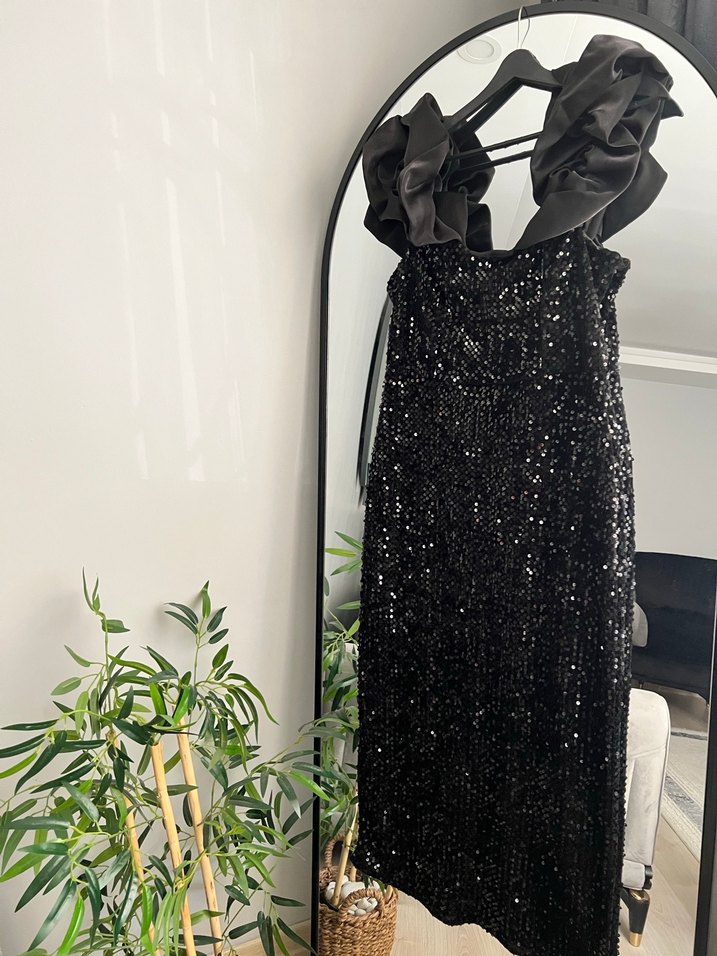 Nakış detaylı siyah uzun abiye elbise, fırfırlı askılar ve straplez yaka ile. Düzenli kesim, gotik ve şık parti tarzı için uygun. ✨