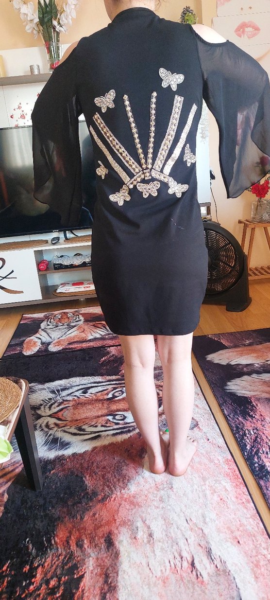 Nakışlı detaylara ve tokalı tasarıma sahip, siyah ve vücuda oturan elbise . İpek gibi kumaştan üretilmiş, romantik buluşmalar için goth ve bohem tarzında.