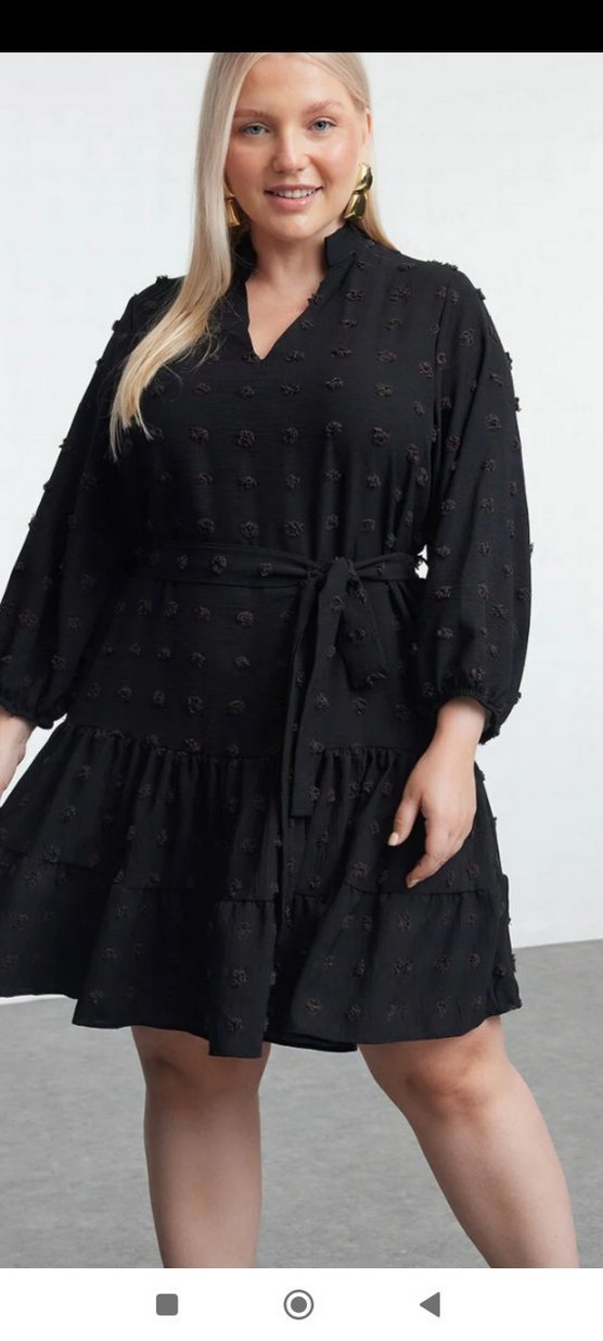Siyah midi elbise, bol kesim ve kemerli bel ile. V yaka ve nakışlı detaylara sahip 1 kere 2 saat oğlumun doğum gününde giydim