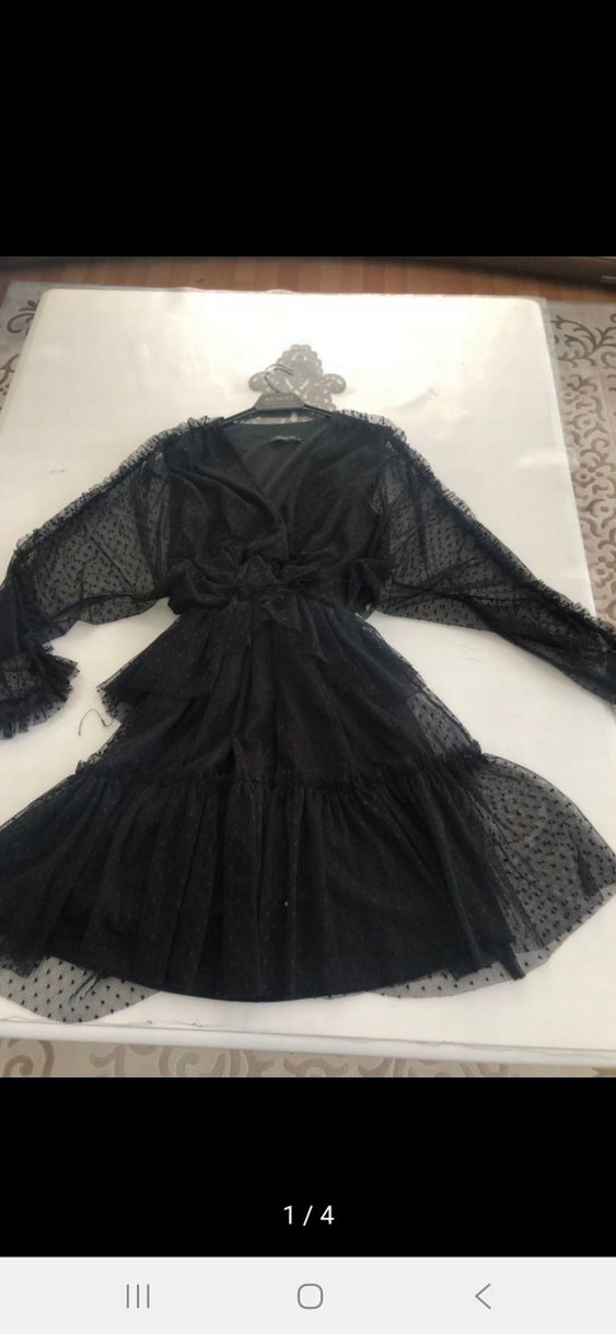 Siyah, nakışlı mini elbise bol kesim, fırfırlı katmanlar, V yaka ve askılı kollara sahiptir, gotik parti için uygundur.