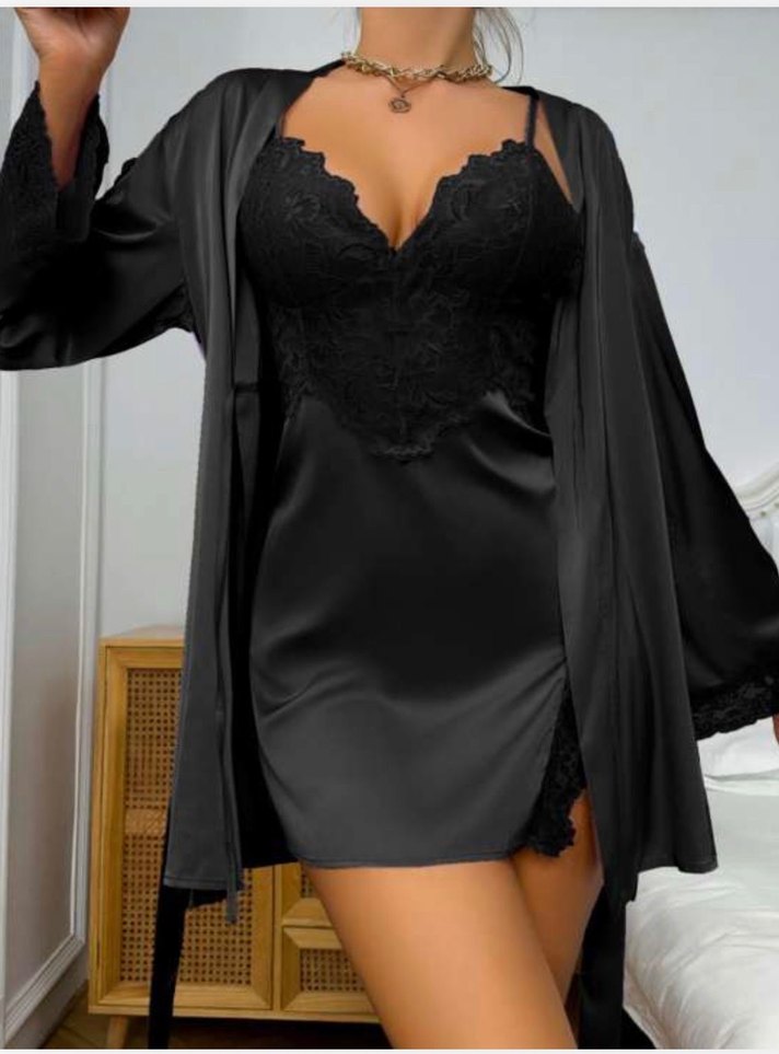 Nakış detaylı, ince askılı siyah mini gecelik, uyumlu sabahlıkla birlikte. Koyu ve şık gotik tarzı yansıtıyor.