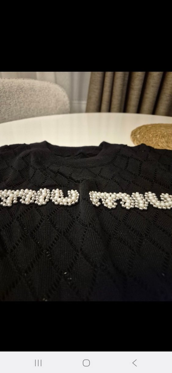 Siyah renkli, nakışlı inci detaylı, kısa ve bol kesim örgü kadın kazak. Yuvarlak yaka ve uzun kolludur, rahat ve sokak stilini yansıtır. sıfır ürün