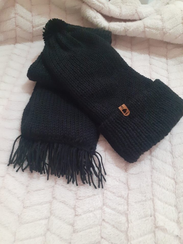 Nakış detaylı siyah örgü çocuk beresi ve atkısı, sokak stiline uygun. Atkı uçlarında püskül bulunur.