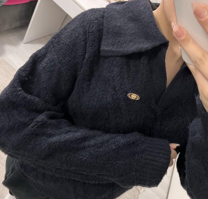 Siyah renkte, uzun kollu, yakalı ve nakış detaylı örgü kadın kazak. Rahat kesimi ve midi boyuyla gündelik sokak stiline uygundur.