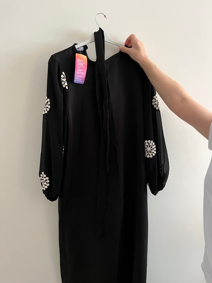 Siyah uzun elbise, nakışlı detaylar ve püsküllerle süslenmiş. Uzun kollu, bol kesim ve ipeksi kumaştan, halter yaka tasarımlı. Romantik geceye uygun sıfır ürün etiketli