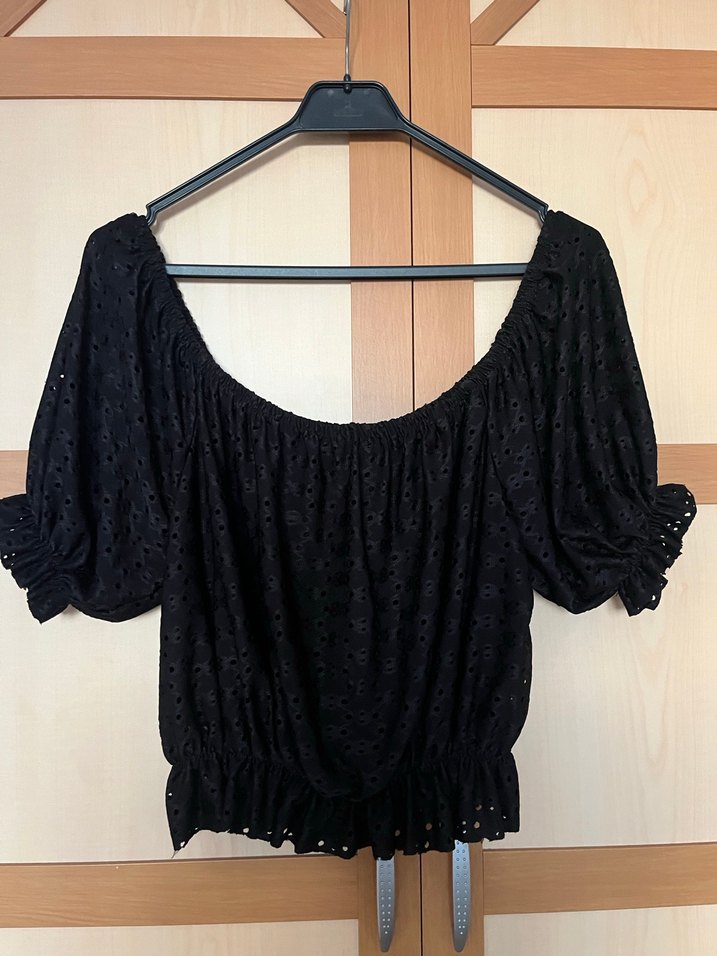 Siyah mini bluz, tekne yakalı ve kısa kollu, nakışlı detaylar ve fırfır süslemelidir. Bol kesim, gotik ve retro tarzda.