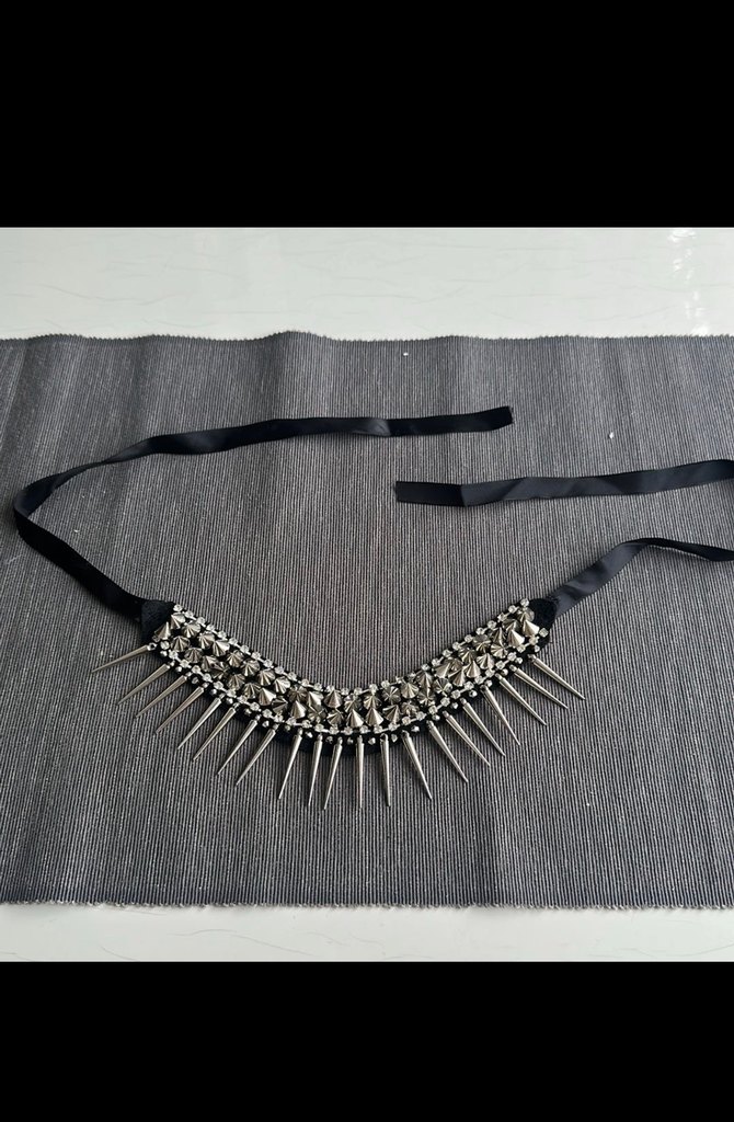Siyah renkte, nakışlı ve boncuklu sivri uçlu rock punk tarzı midi uzunlukta kadın kolye, gotik bir hava sunar.