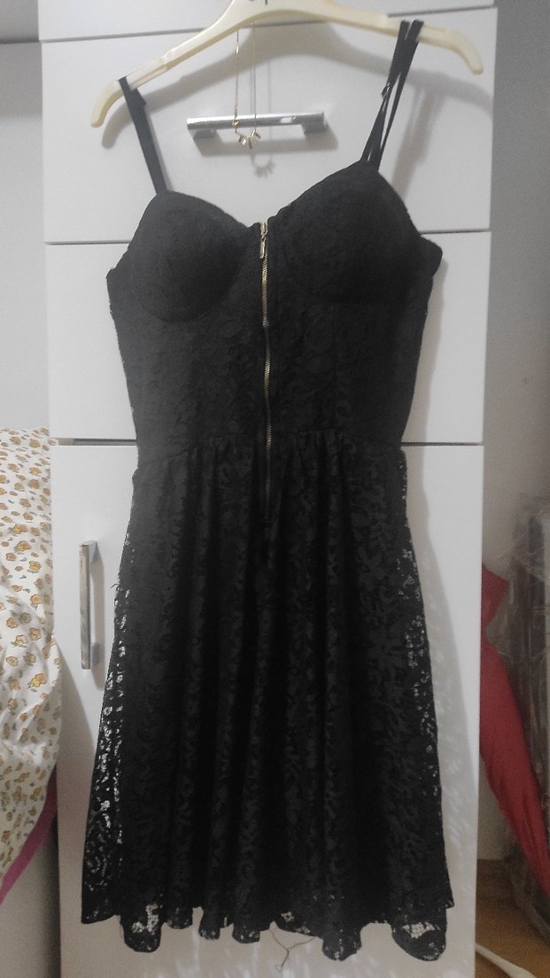 Siyah, nakışlı, straplez midi boy gotik elbise, ön fermuarlı ve vücuda oturan kesime sahip. Cesur romantik akşamlar için uygun. boyu 82 kol arasi 35 cm