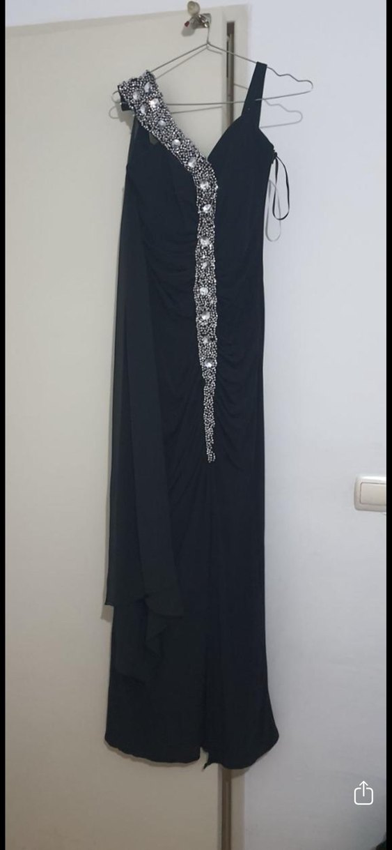 Siyah, straplez ve nakışlı detaylara sahip, drapeli ve vücuda oturan uzun abiye elbise, Adl marka