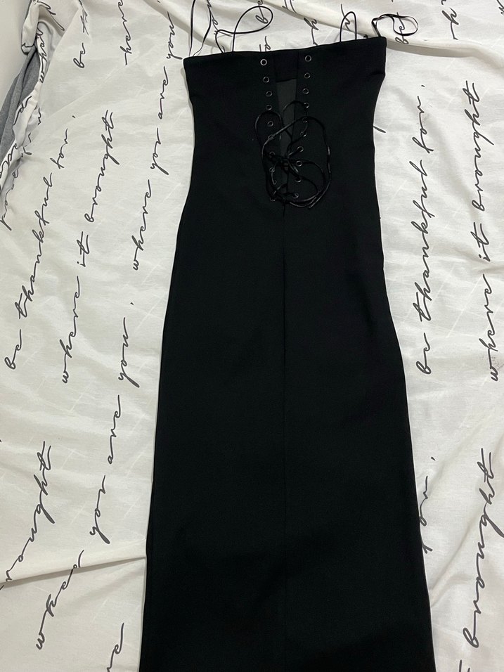 Siyah, straplez yakalı, nakışlı uzun elbise. Sentetik kumaştan, vücuda oturan kesimi ve yırtmaç detayıyla gotik tarzı yansıtıyor.