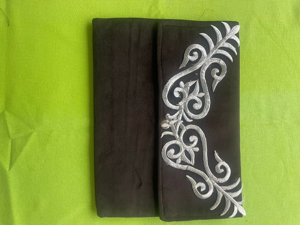 Siyah süet kadın portföy çanta, beyaz nakış ve dantel detaylarıyla düğün ve mütevazı gotik tarzlar için uygun.