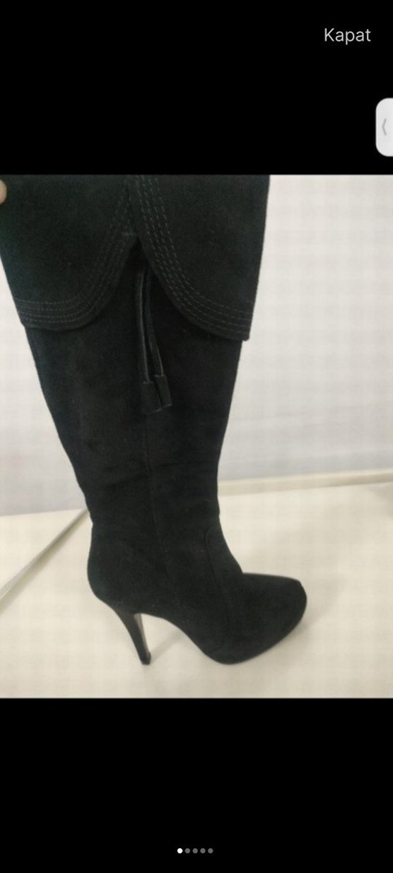 Siyah Nakışlı Süet Dizüstü İnce Topuklu Bot