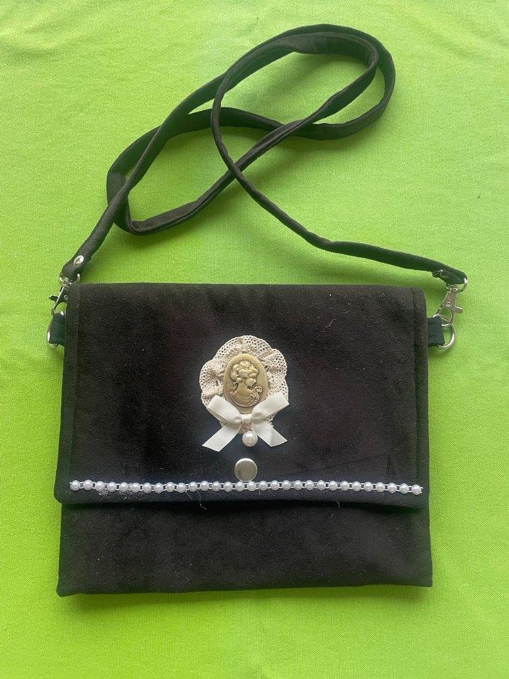 Nakışlı detaylara ve tokalı kapaklı siyah süet goth çanta, günlük kullanım için vintage Paris tarzı sunar.