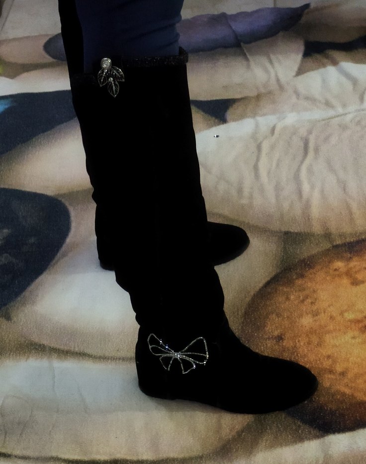 Siyah süet kadın çizme, yüksek topuklu, nakışlı desenli ve tokalı detaylara sahip, gotik tarz için uygun.