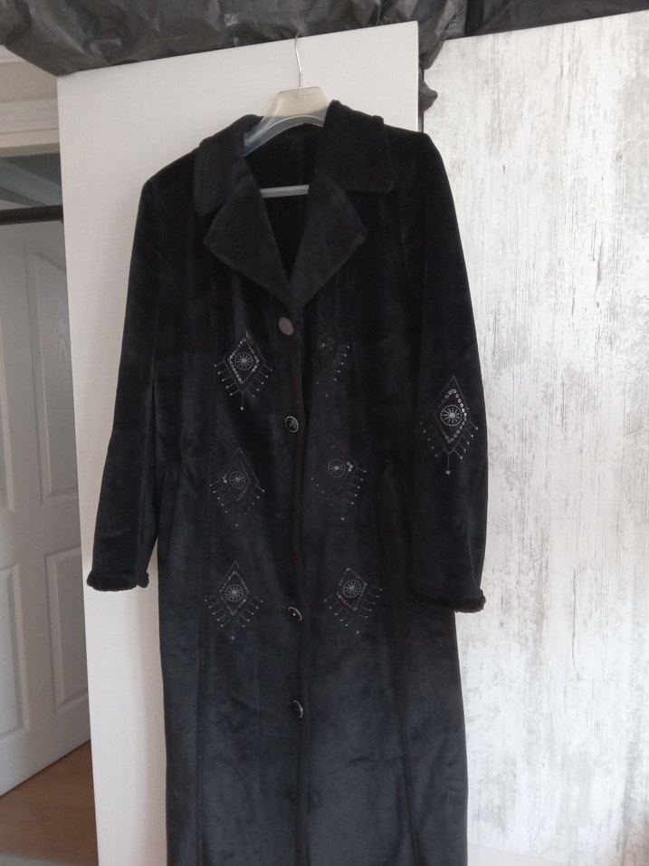 Nakış detaylara ve düğmeli kapamaya sahip siyah süet kadın uzun kaban. Notlu yaka ve uzun kollu, düzenli kesimle gotik tarzda.