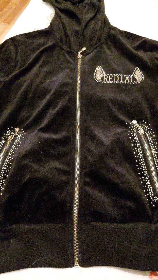 Siyah süet kumaştan, kapüşonlu ve fermuarlı, uzun kollu, nakışlı goth tarzı midi uzunlukta cekettir. REDIAI markası önde yer alır.✨