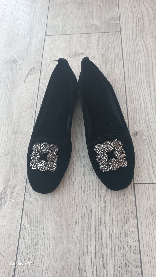 Siyah renkte, nakış detaylı ve tokalı kadın düz ayakkabılar. Ev ayakkabısı