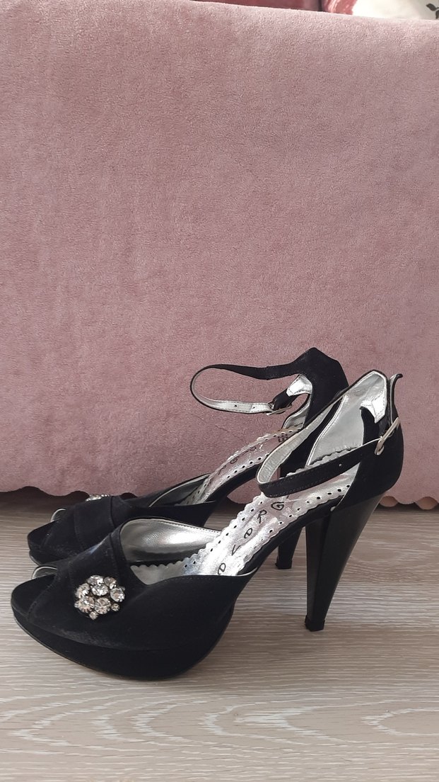 Siyah, parlak yüzeyli yüksek topuklu kadın ayakkabılar, nakışlı detaylara ve tokalı kayışa sahiptir. Düğün ve özel anlar için uygundur. topuğu 10 cm