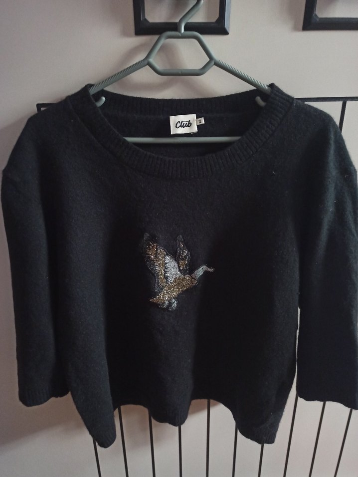 Nakış detaylı triko kazak. Yuvarlak yaka ve uzun kollu, rahat kesim ve normal boyda, günlük sokak stili için uygundur.