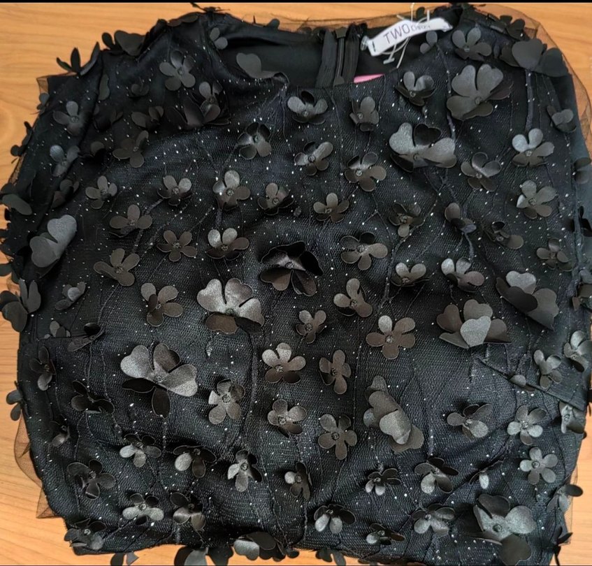 Siyah nakışlı çiçek desenleri ve fırfır detayları bulunan, yuvarlak yaka ve askılı uzun abiye elbisedir.sıfır etiketlidir