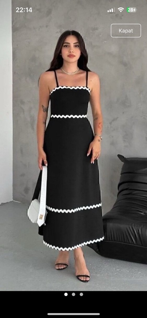 Siyah Nakışlı Uzun Askılı Elbise