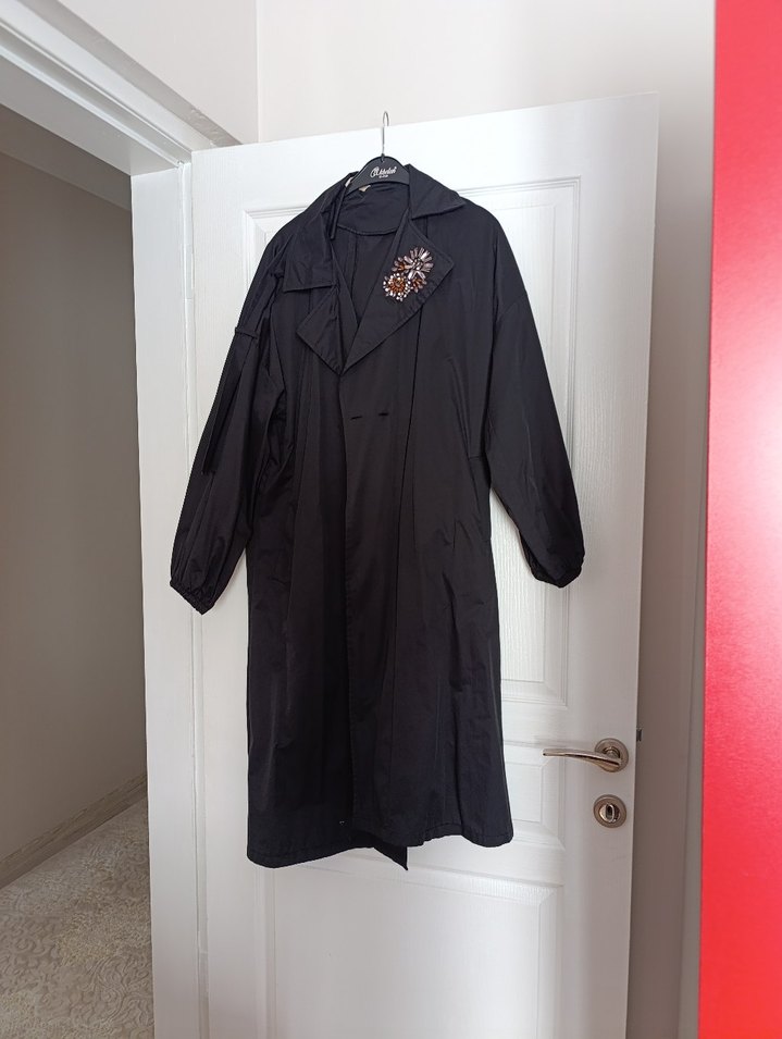 Siyah, uzun, düğmeli trenckot nakış detaylı ve ipeksi kumaştan. Gevşek kesim, uzun kollu, Parisli gotik tarzıyla günlük kullanıma uygun.