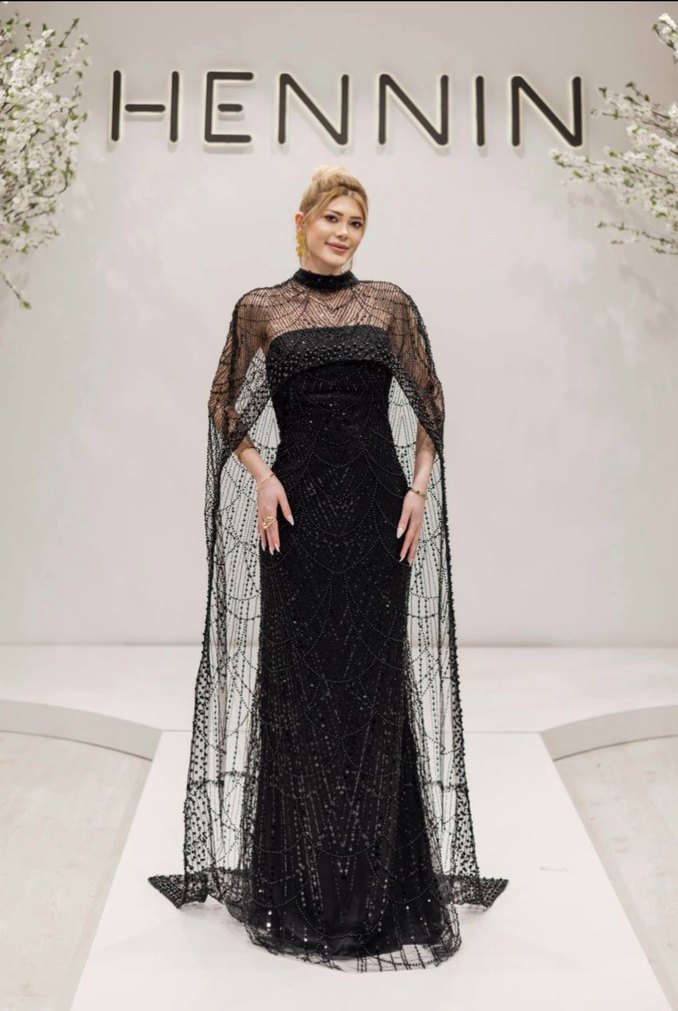 Laci siyah bordo mavi Yüksek yakalı, nakışlı ve drapeli siyah uzun abiye elbise, ince askılı kollara sahip klasik gotik şıklığı sunar.